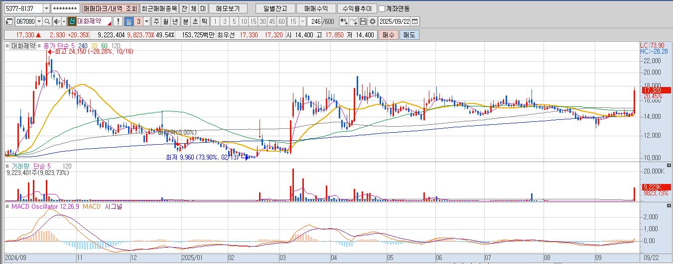 ☞ 2025-09-22 중국 NMPA로부터 치매 치료제 '리바멘사패취' 품목허가 승인 소식에 급등(상한가)