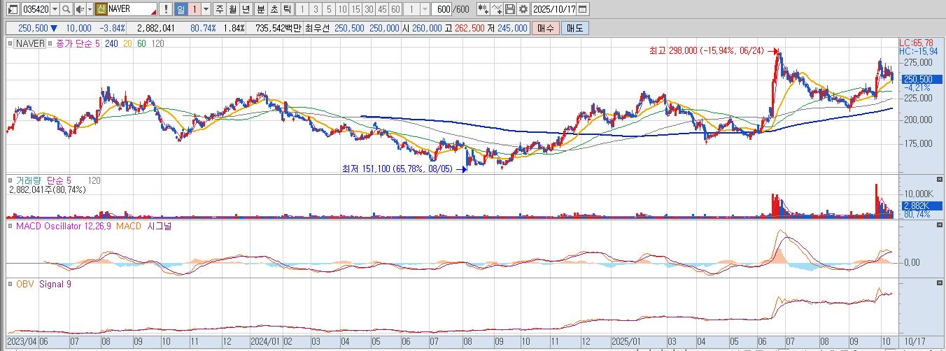 일봉차트에서는 2023년 8월 초에 최저점 151,100원을 기록한 후 점진적인 상승 흐름을 보이다가, 2025년 6월 24일에 최고점 298,000원을 찍은 후 약 16% 조정이 있었습니다. 현재 주가는 250,500원으로, 5, 20, 60, 120일 이동평균선이 모두 근접해 있으며, 전반적으로 상승 모멘텀이 유지되는 모습입니다.